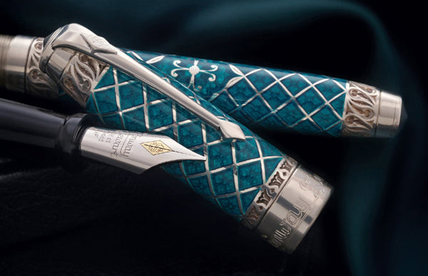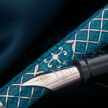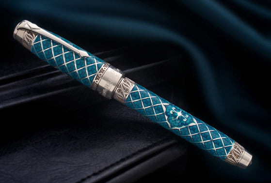 The use of a deep rich Teal colour in the enamel with striking contrasts is true to the gothic style. It gives emphasis and depth to the low relief. This is known as Basse Taille enameling. Both the cap and barrel of the Westminster edition are meticulously crafted out of solid sterling silver, bearing the English hallmark.