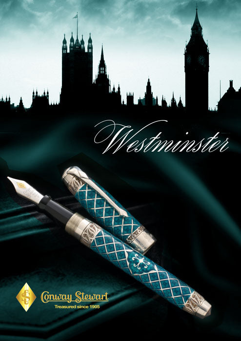 The Westminster limited edition pen is available in an edition of just 100 fountain pen or roller ball writing modes. The fountain pen is mounted with the large rhodium plated, iridium tipped 18 carat solid gold nib, offered in eight grades. It utilizes the converter cartridge filling mechanism.