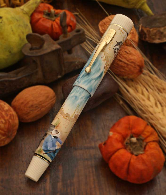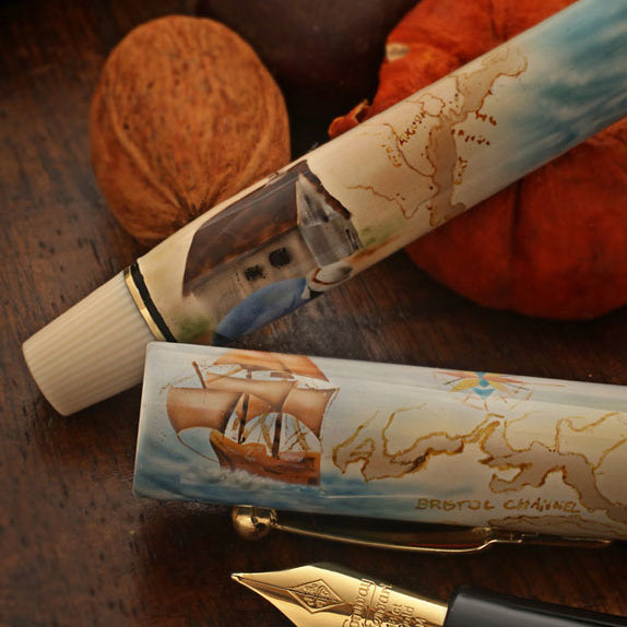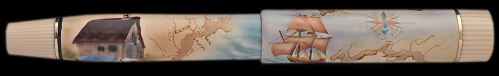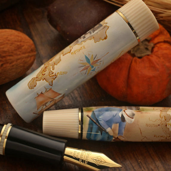 The Conway Stewart Pilgrim Limited Edition has been created using the art of airbrush and hand painting to evoke scenes from the history of the First Pilgrim settlers.