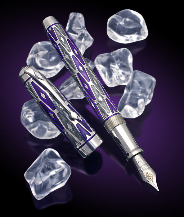 Das aus massivem Sterlingsilber gefertigte Aztec verfügt über eine präzise Gravur in einem komplizierten Muster aus abstrakten Diamanten, das an den klassischen Look der Art-Déco-Zeit erinnert. Jedes Panel, das die Kappe und den Schaft schmückt, ist mit von Hand aufgetragener durchscheinender Emaille in leuchtendem Lila und sattem Grau gefüllt. Die darunter liegenden Gravurmuster sind durchscheinend und hinterlassen ein Design, das sowohl raffiniert als auch elegant ist, aber auch bei jedem Licht ein Blickfang ist. Durch den gravierten Kanal und die von Hand aufgetragenen Emaille-Zierbänder aus tiefviolettem Email erhält die Kappe und das Schaftende weitere gestalterische Aufmerksamkeit.
