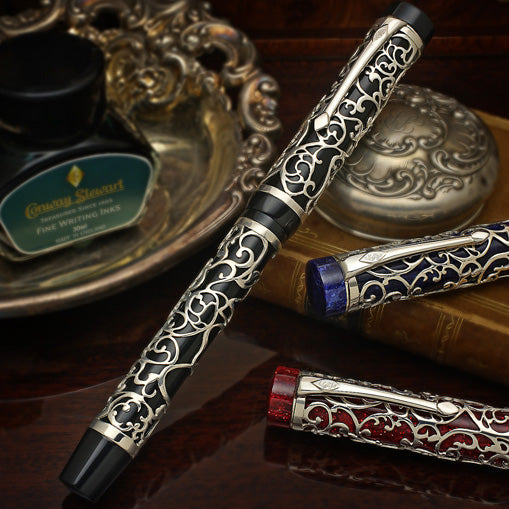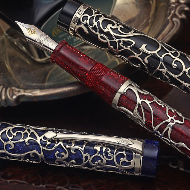 Die Chatsworth Collection ist ein neues Overlay-Design, das der preisgekrönte Künstler Henry Simpole für Conway Stewart in Auftrag gegeben hat. Dies ist mit Abstand das detaillierteste und aufwendigste filigrane Design, das Simpole bisher für Conway Stewart entworfen hat, und zum ersten Mal machen wir die Chatsworth-Kollektion auf einer Leinwand verfügbar, die aus drei unserer beliebtesten Harze besteht: Classic Black, Blue Stardust und Roter Sternenstaub.