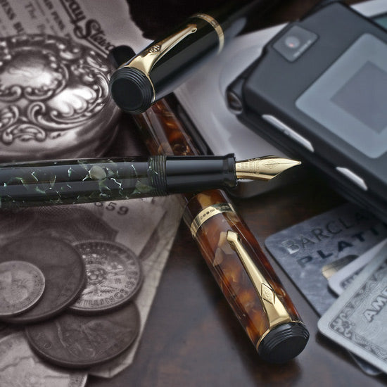 Con líneas ordenadas que recuerdan a las primeras plumas de Conway Stewart y tres colores clásicos y hermosos, esta pluma también luce el primer capuchón escalonado y el primer extremo del cuerpo que la compañía ha utilizado desde principios del siglo XX. El negro clásico es sobrio y elegante en negro con ribetes dorados; el clásico marrón jaspeado tiene hermosas variaciones del leonado al siena; y el verde clásico veteado tiene verdes y grises intensos con un toque ocasional de blanco. Según me han dicho, el verde es actualmente el color más popular en Inglaterra; Personalmente, me resultaría difícil elegir entre este y el marrón, ya que me encantan ambas familias de colores. El negro también es bastante hermoso y sin duda atraerá a aquellos cuyo fuerte es la sutileza.