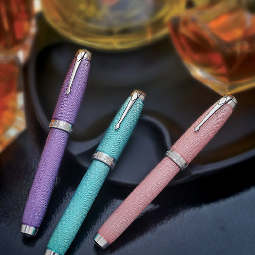 El Nightingale es un pequeño bolígrafo maravilloso. Acento en lo "pequeño". Basado en su serie Dinkie en miniatura, el Nightingale es una gema maciza de plata esterlina, con una capa de esmalte adherido en tres tonos pastel. Cherry Blossom es un color rosa claro, Mauve es un tono lavanda intenso y Mint Green es un verde pastel claro.