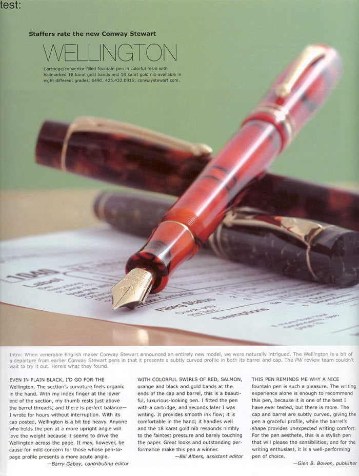 Cuando el venerable fabricante inglés Conway Stewart anunció un modelo completamente nuevo, naturalmente quedamos intrigados. La Wellington se aleja un poco de las anteriores plumas Conway Stewart en el sentido de que presenta un perfil sutilmente curvado tanto en el cuerpo como en el capuchón. El equipo de revisión de PW estaba ansioso por probarlo. Esto es lo que encontraron.