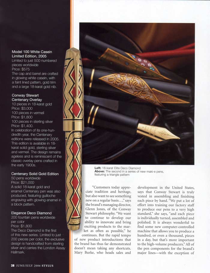 "Los clientes de hoy aprecian la tradición y el legado, pero también quieren ver algo nuevo con regularidad...", dice el director general de la marca, Glenn Jones, sobre la filosofía de Conway Stewart. "Queremos seguir desarrollando nuestra capacidad de innovar y lanzar al mercado productos interesantes con la mayor frecuencia posible", continúa. Pero el rápido ritmo de introducción de nuevos productos que la marca ha demostrado hasta ahora no significa tomar atajos. Mary Burke, directora de ventas y desarrollo en Estados Unidos, dice que Conway Stewart está realmente interesado en ensamblar y terminar cada pieza a mano. "Nos esforzamos mucho en capacitar al personal de nuestra fábrica para producir nuestros bolígrafos con un estándar muy alto", dice, "y cada pieza se gira, ensambla y pule individualmente. Siempre es maravilloso encontrar alguna máquina nueva controlada por computadora". eso te permite producir cien o incluso mil piezas en un día, pero eso es más importante para los productores de gran volumen".