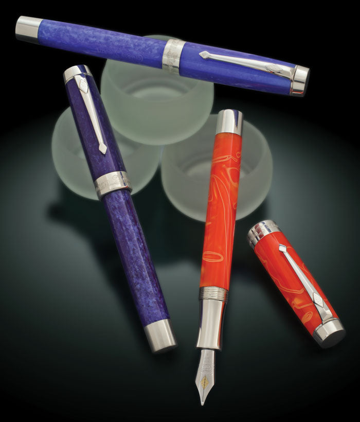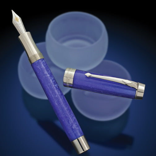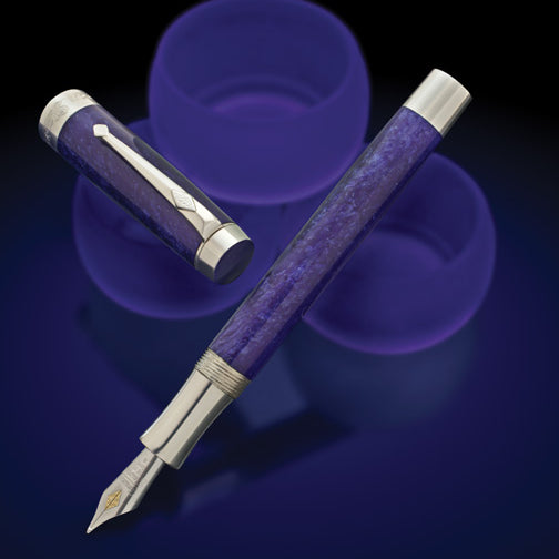 Pour un look plus raffiné, choisissez le Sapphire Blue Sterling Duro II. Les nuances marbrées brillantes d'azur profond et de bleu céruléen qui recouvrent à la fois le capuchon et le corps sont parfaitement mises en valeur par la garniture en argent sterling brillant, avec les couleurs de base parsemées de reflets chatoyants qui dansent dans la lumière.