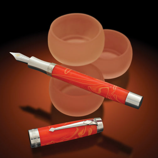 Découvrez le Peach Melba Sterling Duro II, un stylo orange vif qui brille d'une lumière intérieure alors que de riches veines de jaune clair et de crème dansent sur toute la surface du capuchon et du corps. Nommé d'après le plat à dessert créé par Auguste Escoffier à l'hôtel Savoy de Londres à la fin des années 1800 pour la chanteuse d'opéra Nellie Melba, ce stylo est tout aussi savoureux que le plat lui-même.