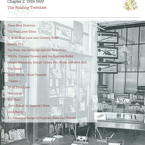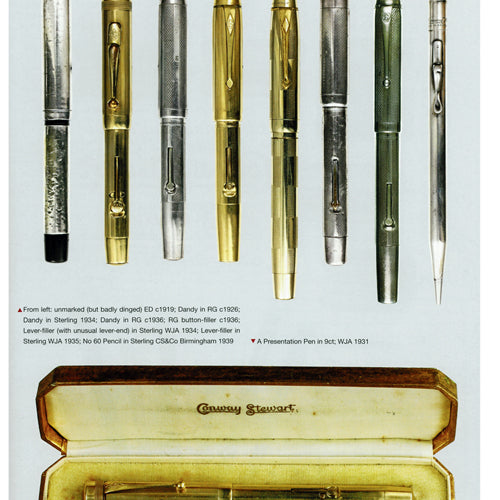 Hull raconte méticuleusement l'histoire et le développement de Conway Stewart ; détaillant le matériel inédit, les documents et la correspondance internes de l'entreprise, les prototypes, les brevets, les marques déposées, les matériaux utilisés, notamment le celluloïd et la caséine, les superpositions et les poinçons, les publicités imprimées, le développement et la conception de tous les modèles Conway Stewart depuis 1905 et bien plus encore !