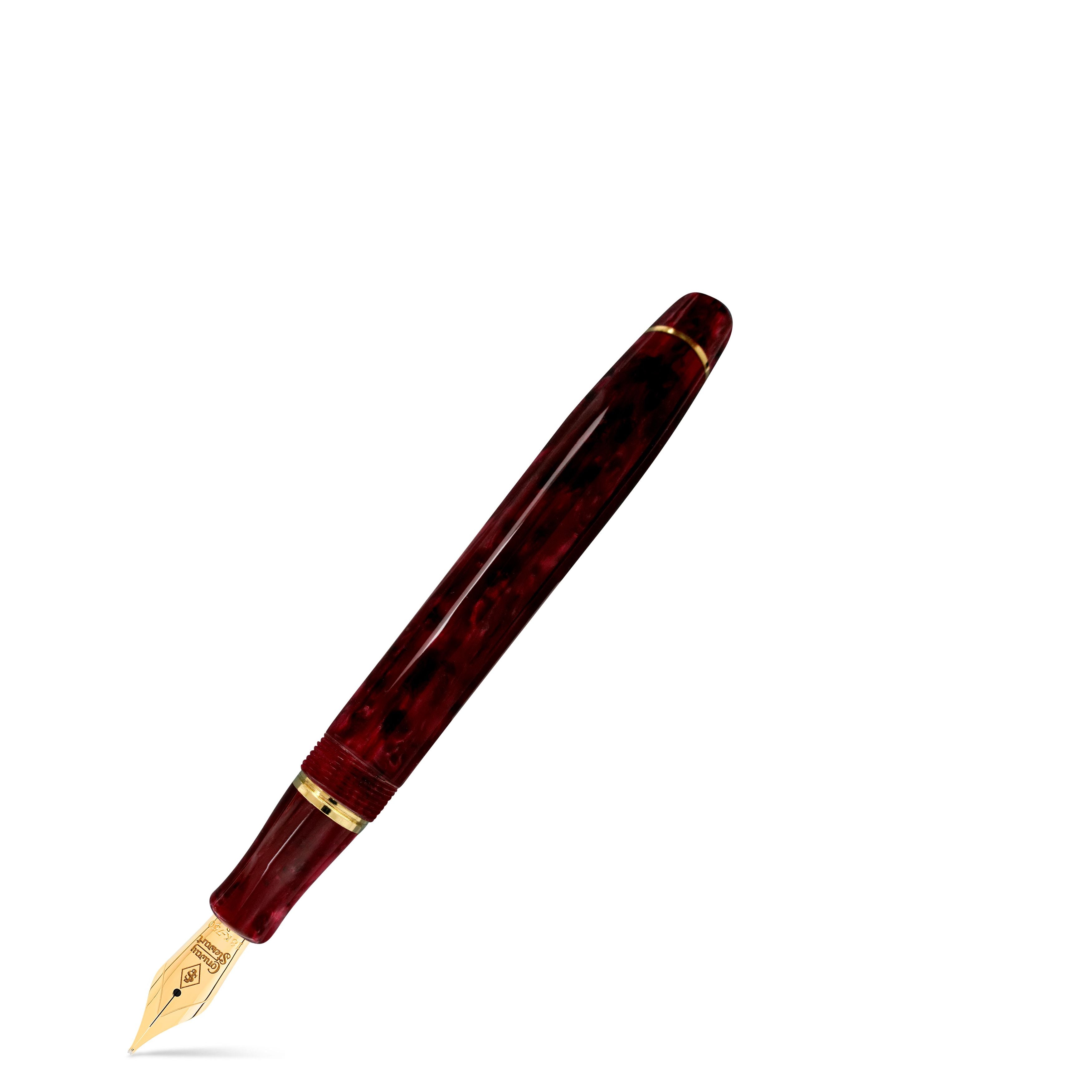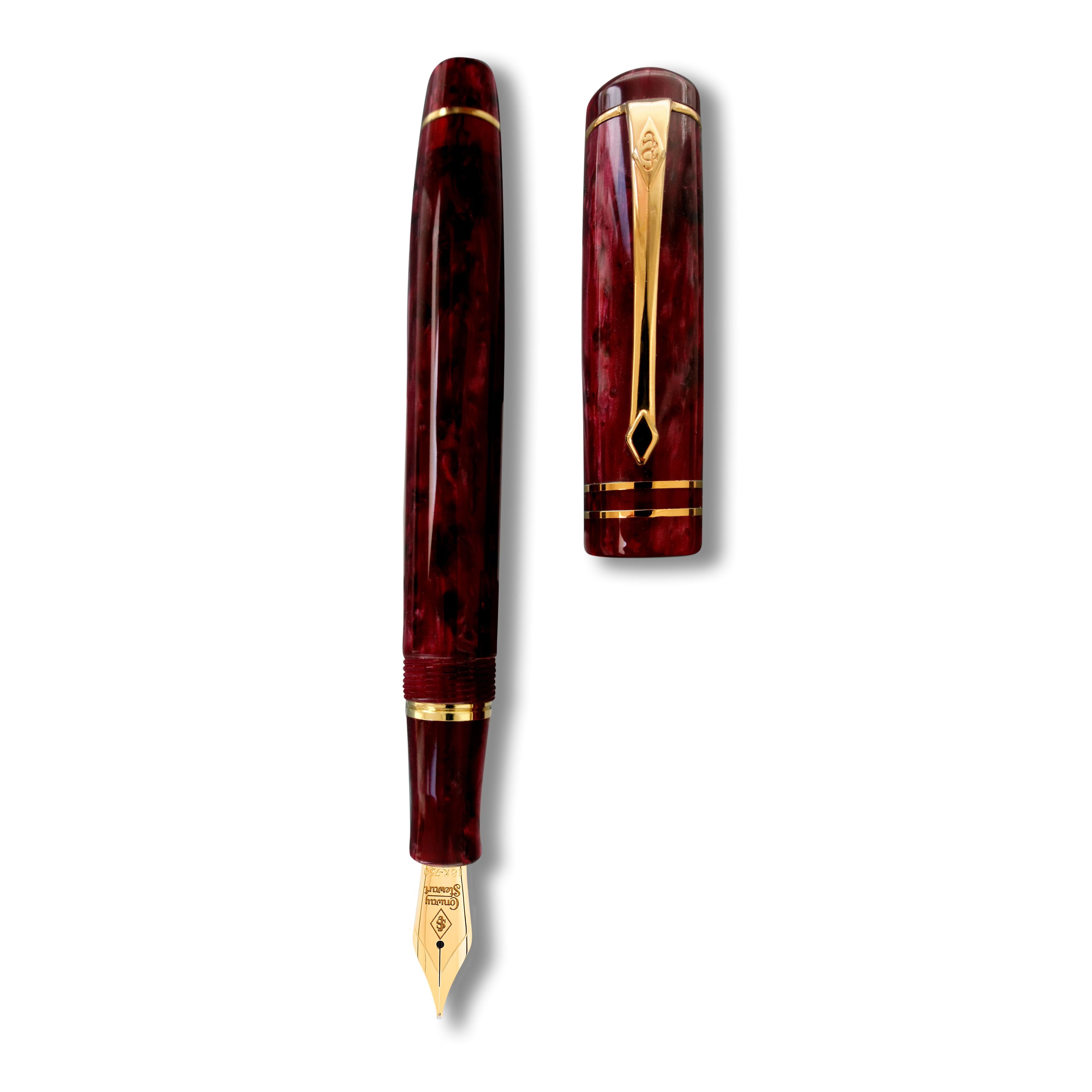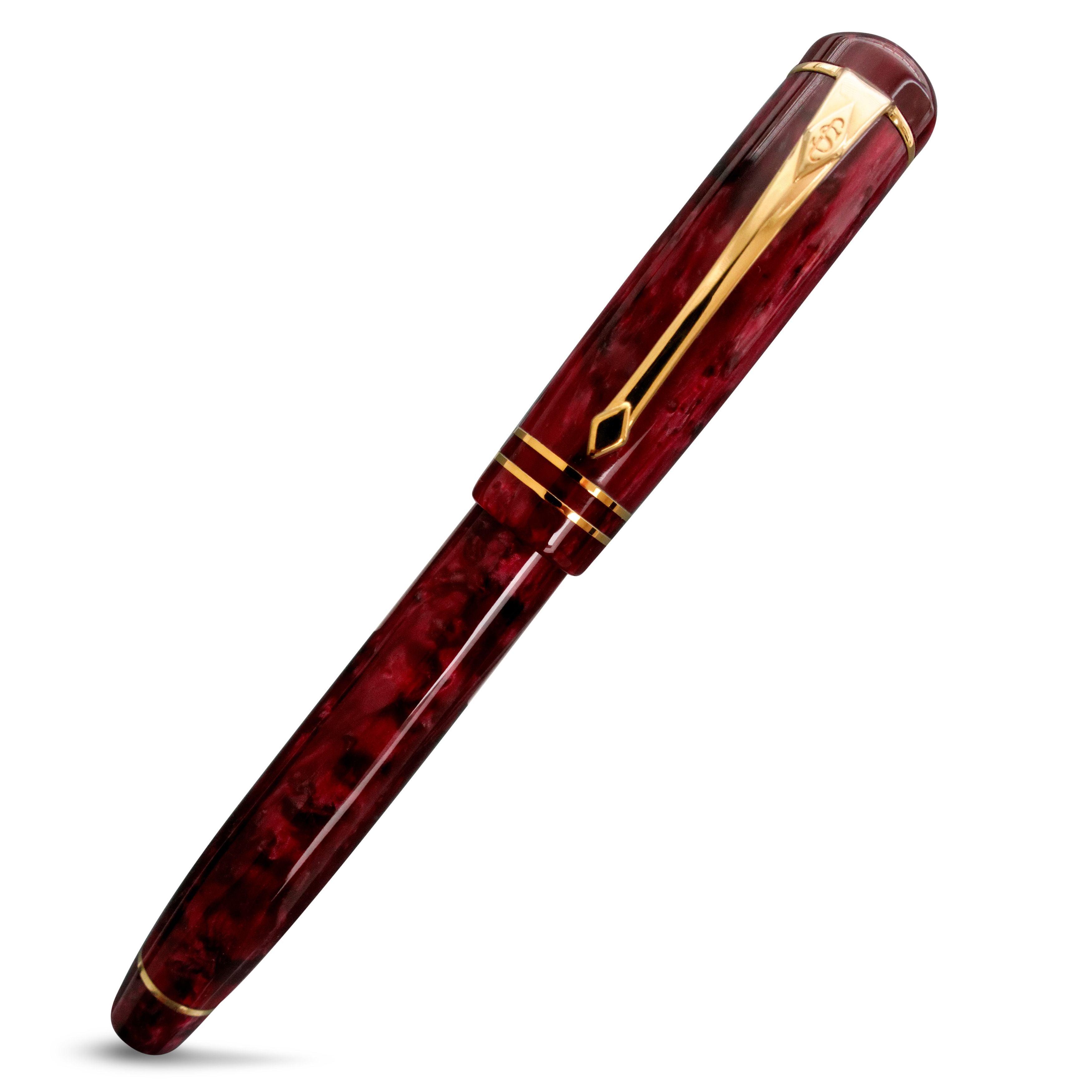 Conway Stewart Wordsworth Burgundy Blush 万年筆のご紹介 - 人気の Winston を彷彿とさせるエレガントな丸みを帯びたクラシカルなスタイルの万年筆です。中型のペンは、先細りのバレルと、キャップとバレルに純金のバンドがあり、暖かさと高級感を醸し出しています。クラレットの色合いの複雑なアクリル素材で作られた、同じペンは 2 つとなく、所有者と同じくらいユニークです。当初50本の限定版で発行されたペンは、12本しか残っていません。ファイン、ミディアム、ブロードの 2 色の 18 ct ゴールド フラッグ ペン先から選べる万年筆があり、デスク スタンドとしても使えるブラック レザー ボックスに入っています。