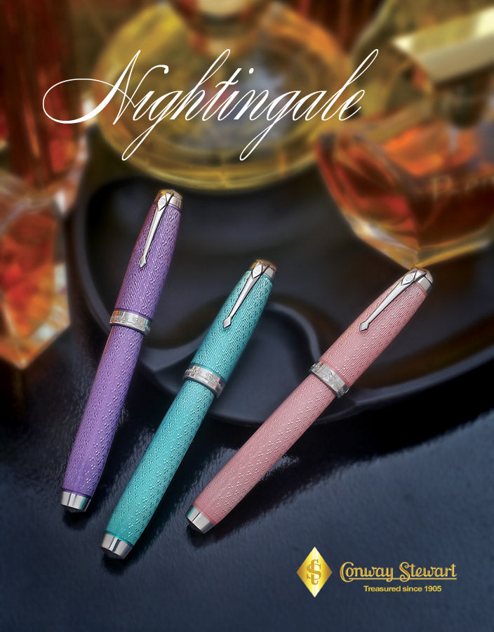 Nightingale 笔是 Conway Stewart 的 Elegance 系列的一部分,它们的设计是为了纪念这位护理偶像。这些小巧的钢笔采用标志性纯银制成,笔帽和笔身上刻有非常精细的扭索狐狸头图案,其设计灵感来自 Fabergé。然后,每支笔都巧妙地涂上充满活力的粘合珐琅,使其具有三种现代柔和色调:樱花、淡紫色和薄荷绿。